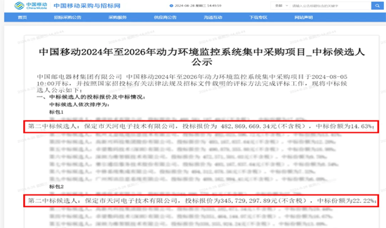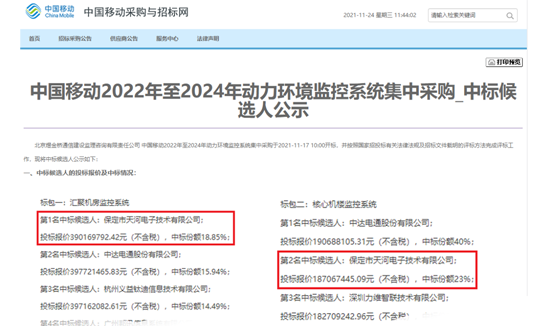 近日,保定市天河電子技術有限公司以兩個第二名的優異成績,成功中標中國移動2024-2026年動力環境監控系統集采項目的匯聚機房與核心機樓雙標段。